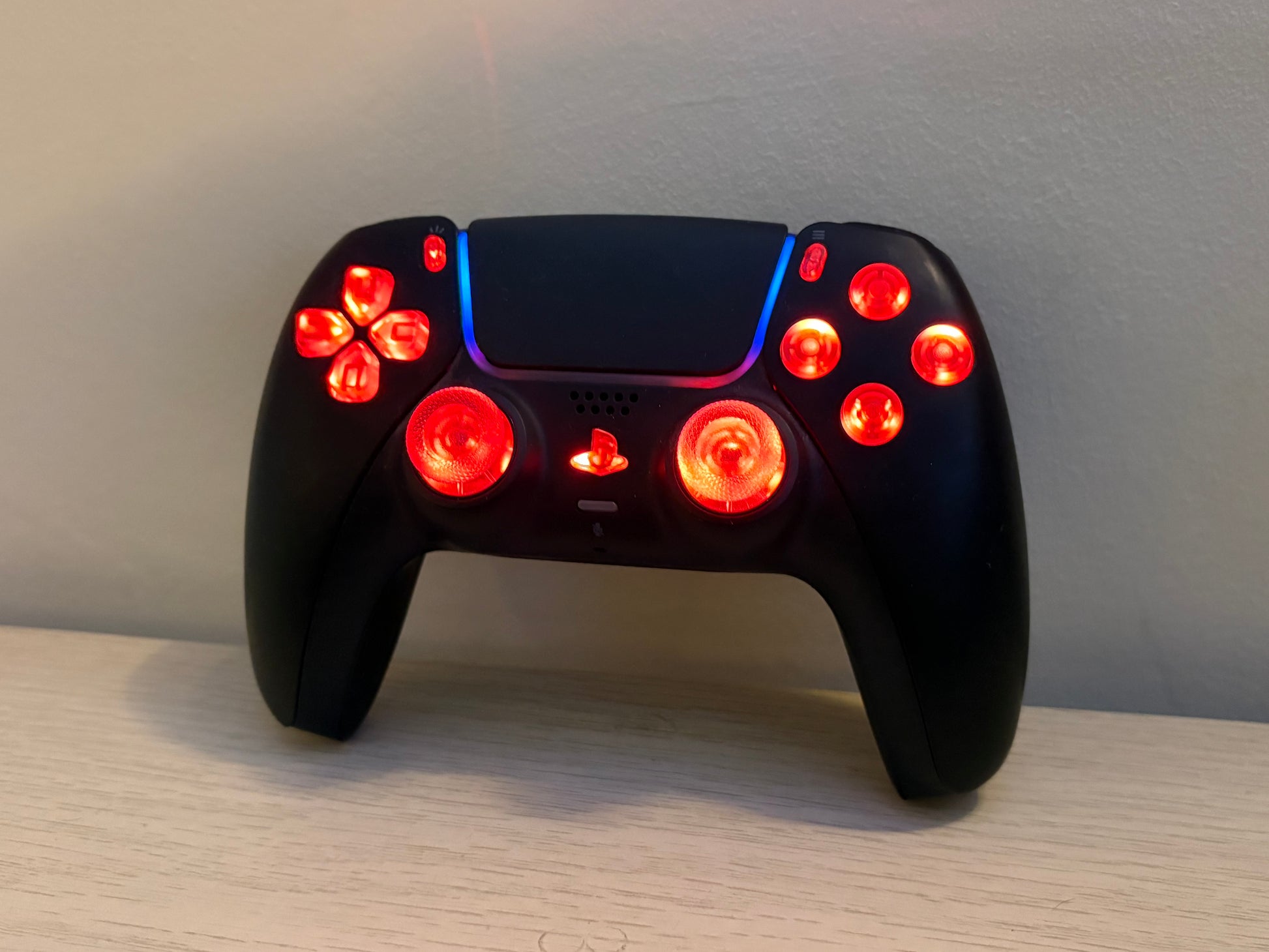 This listing is for a Sony DualSense controller for the PlayStation 5, upgraded with custom RGB LED lighting for a distinctive look. The LEDs illuminate the touchpad and lightbar zones with adjustable color effects, giving your setup a standout aesthetic.